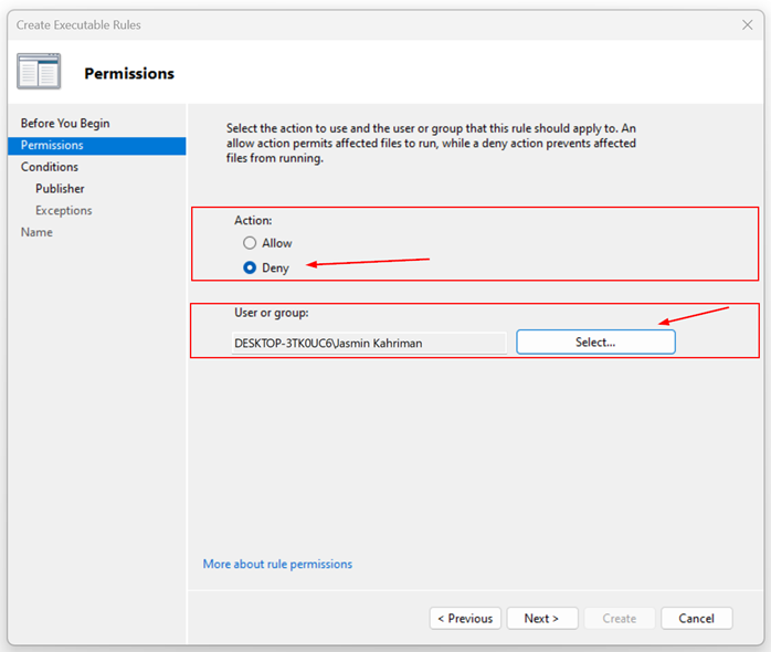 - Under Permissions, click Deny, and then click on Select to choose the account that will be denied access to certain apps.