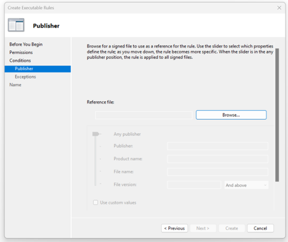 - Under the “Publisher,” click “Browse” to select the reference file you want to deny access to.
