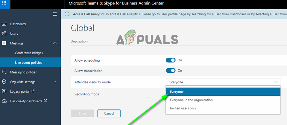 Navigate to Meetings > Live event policies - Open the dropdown menu next to the Attendee visibility mode option.