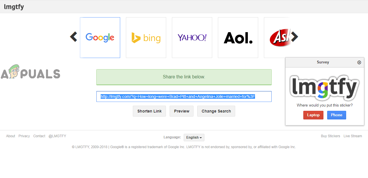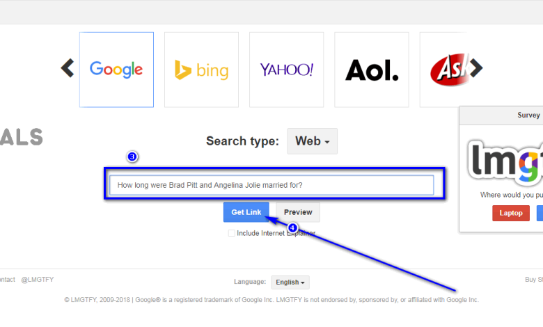 Say someone asks you “How long were Brad Pitt and Angelina Jolie married for?” and, seeing as it is the perfect opportunity to do so, you want to respond to them with LMGTFY. To add insult to injury, you can simply:
