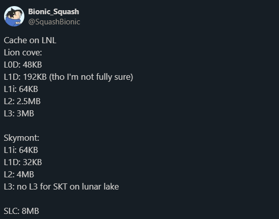 Bionic_Squash says that Lunar Lake packs 2.5MB L2 cache per P-cores, leaving behind 4MB for the Skymont-based E-cores. The L3 slice size remains constant at 3MB, however, Skymont E-cores on Lunar Lake will feature no L3 cache.