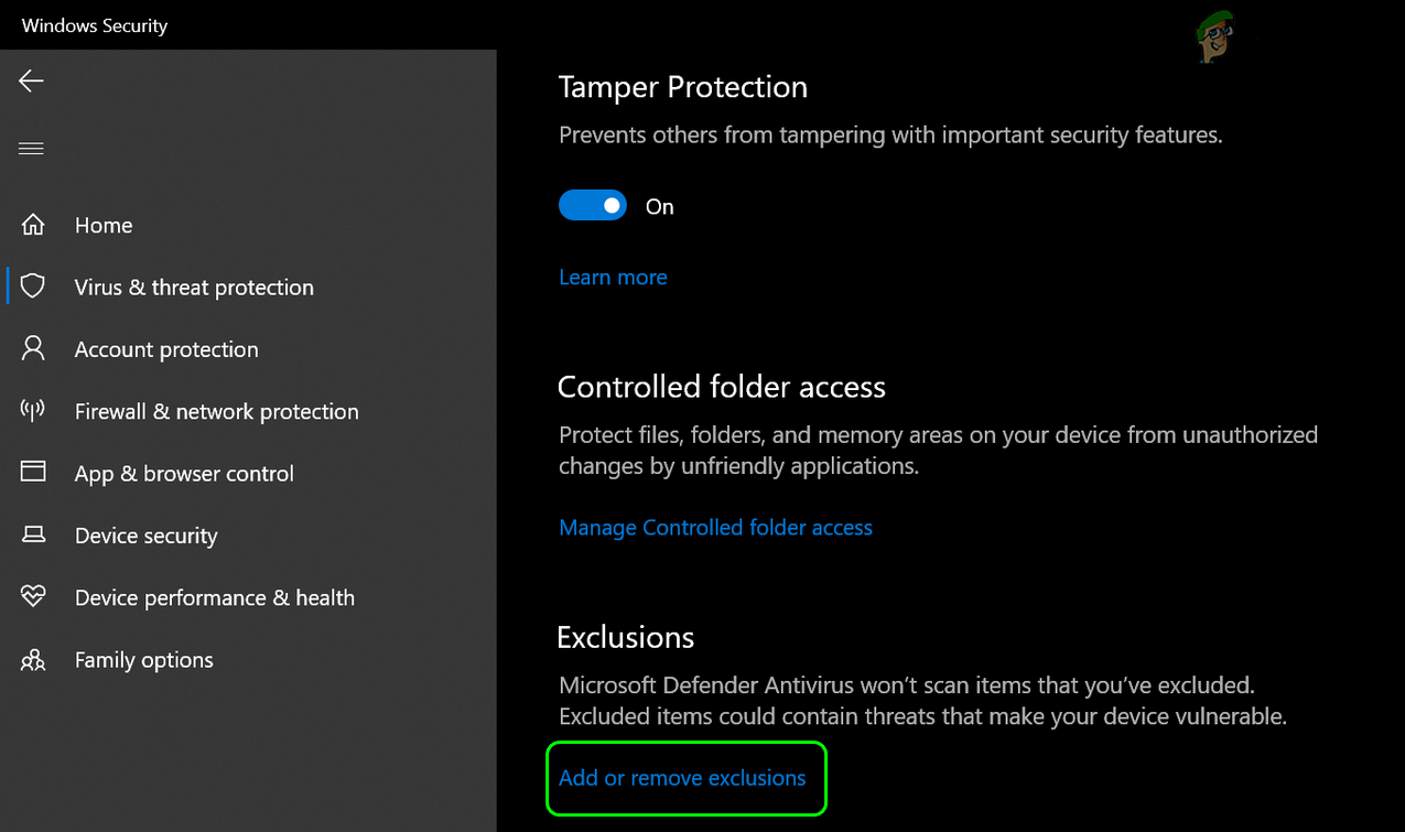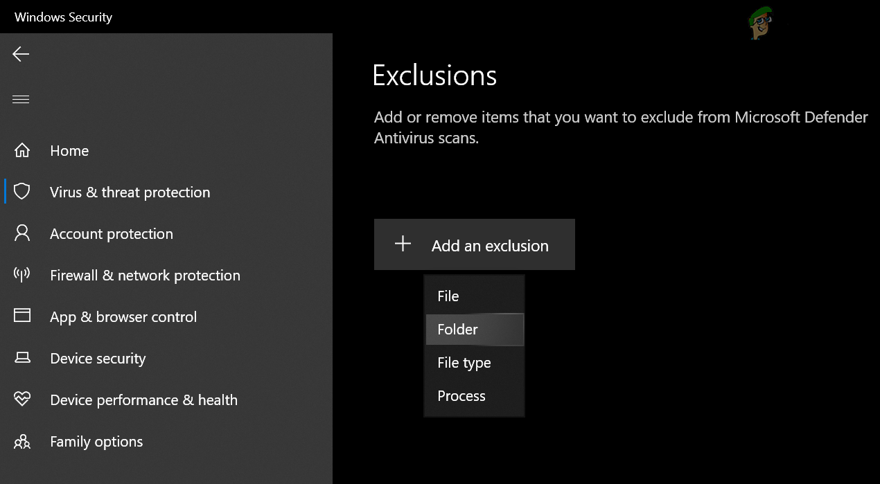 Open Manage Settings Under Virus & Threat Protection Settings - Then open Add or Remove Exclusions under Exclusions.