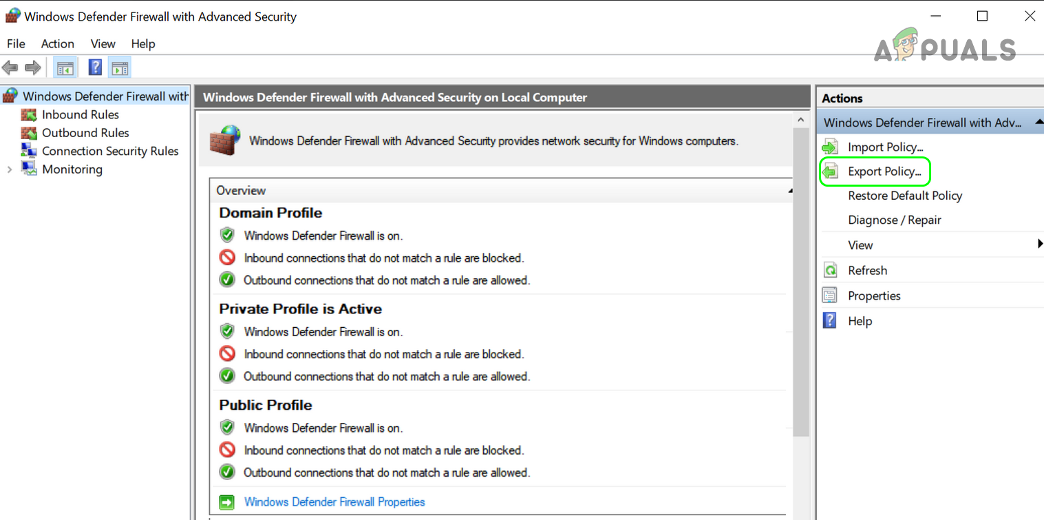 Export Policy of the Windows Defender - Then select the Inbound Rules tab and in the right pane, delete the rules you do not want to keep or not required. It may take some time to complete but be careful, do not delete something essential.