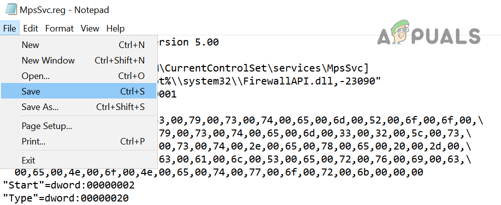 Save the File with .reg Extension - Now select a location to save the file, preferably on the desktop of your system, and enter the name for the file with .reg extension e.g., MpsSvc.reg.
