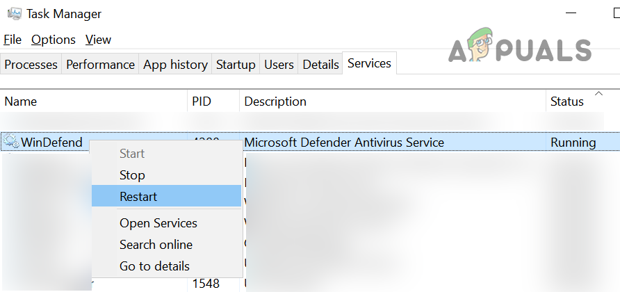 Open the Task Manager from the Quick Access Menu - Now head to the Services tab and right-click on WinDefend (Microsoft Defender Antivirus Service).