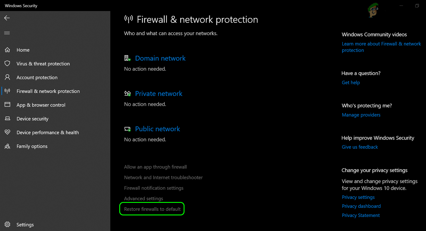 Restore the Windows Firewall to the Defaults - Now head to the Virus & Threat Protection tab (in the left pane) and under Virus & Threat Protection Settings, click on Manage Settings.