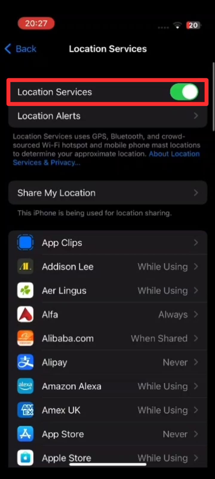 - You’ll see a toggle switch labeled “Location Services” at the top of the screen. Tap the switch to turn on Location Services.