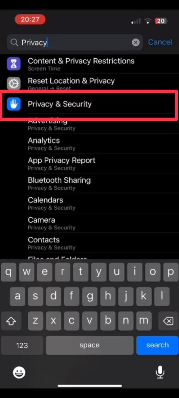 - Scroll down and tap on Privacy.