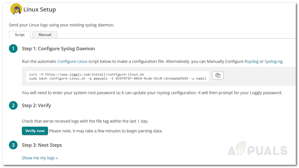- Start monitoring the logs my clicking ‘Show me my logs’.