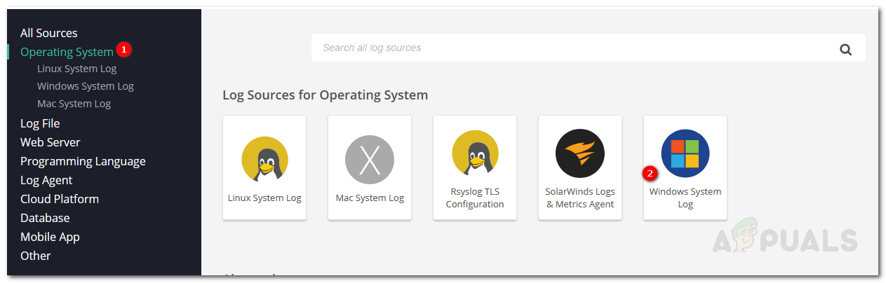 Loggly UI - On the left-hand panel, expand the Operating System menu by clicking on it and then select “Windows System Log.”