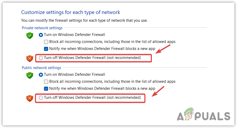 - Here, tick Turn off Windows Defender Firewall (not recommended) for Private Network settings and Public Network settings.
