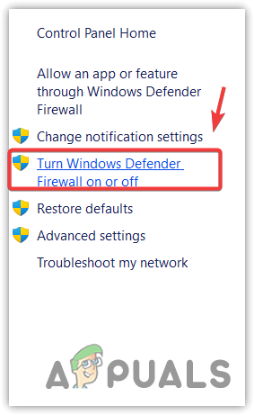 - Click Turn Windows Defender Firewall on or off from the left pane.