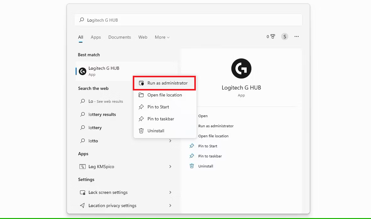 - Right-click on ‘Logitech G Hub’ and select Run as Administrator.