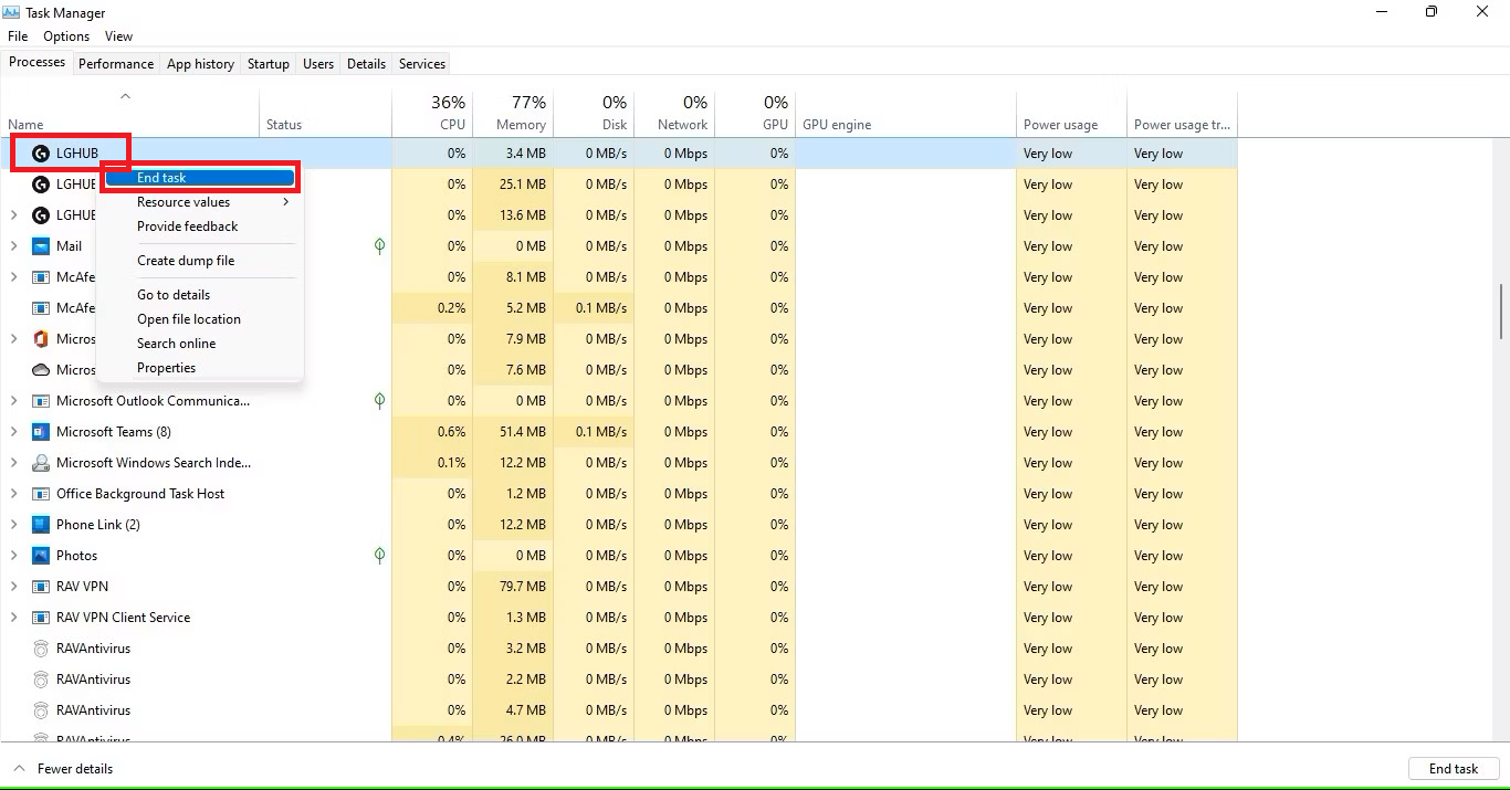 - In Task Manager, locate processes named LGHUB, LGHUB Agent, and LGHUB Updater.