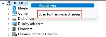 - Click on your computer’s name at the top, right-click on it, and select Scan for hardware changes.