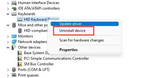 - Double-click on the device category. Right-click on the device and select Uninstall device.