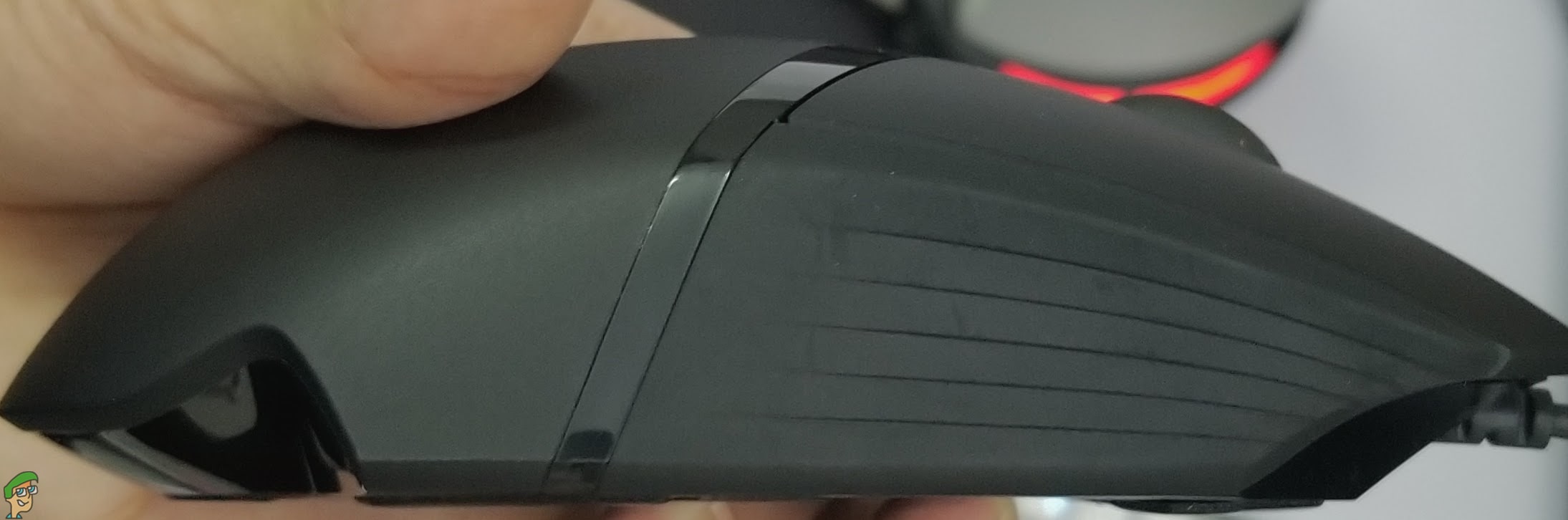 There is a wedge under the side buttons (forward/back) where you can rest your thumb. Sadly, there is no textured material here like on a lot of other mice at this price. Still, it’s very comfortable, but there might be an issue for some. The DPI shift or the sniper button is in a weird place. The fact that it’s right by the place you’d normally put your thumb means you’ll have to adjust a bit to have a comfortable grip with your thumb.