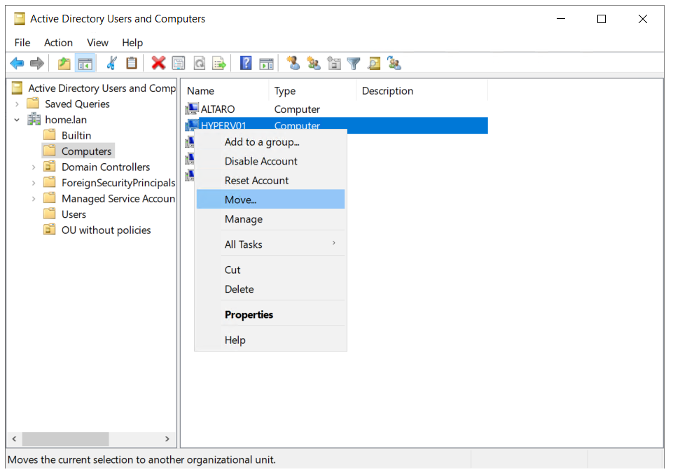 - Right-click on the computer object and then click Move. Move computer objects to the organizational unit that does not have policies applied and then click OK.