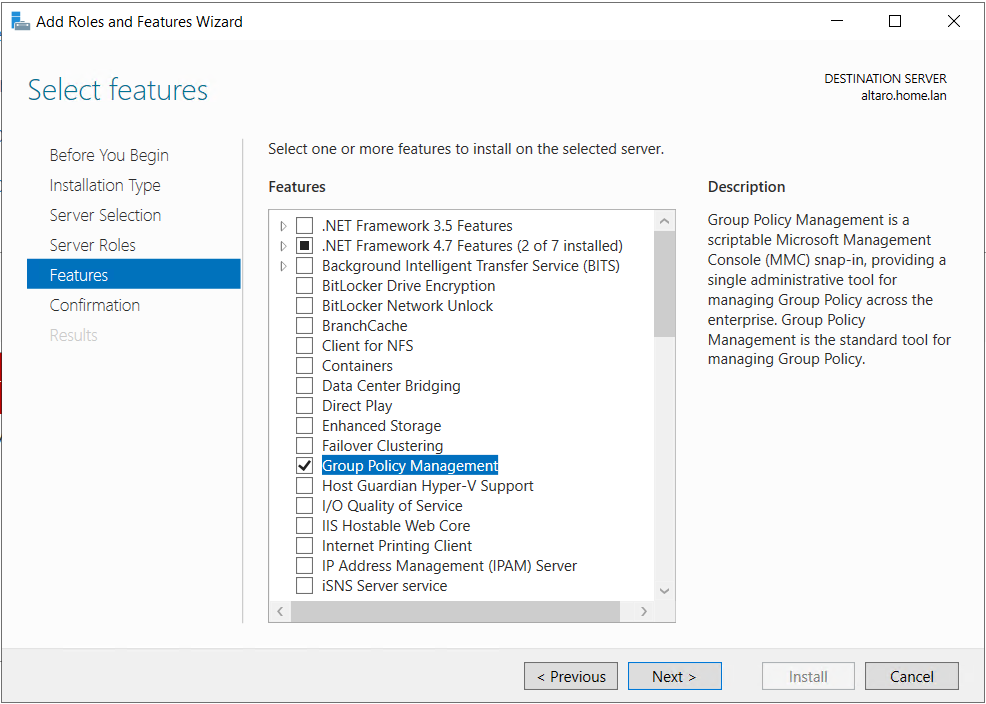 - Select Group Policy Management under Select features option and click Next.