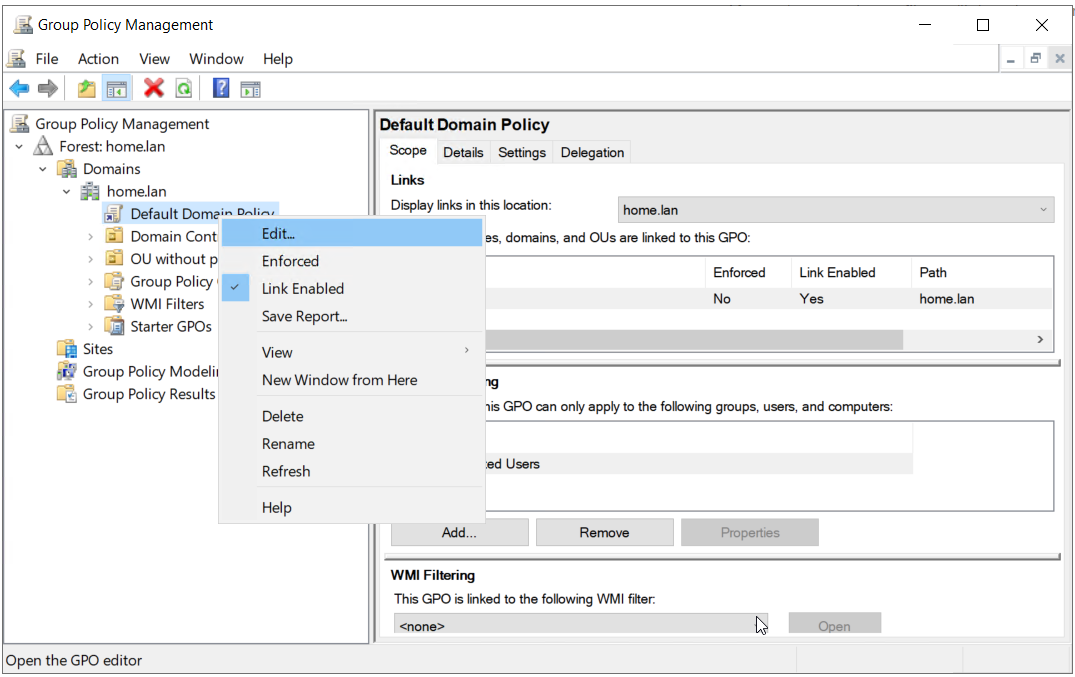 - Expand the domain and navigate to the group policy applied on the Hyper-V server. We will modify the default policy called Default Domain. Right-click on the policy and click Edit