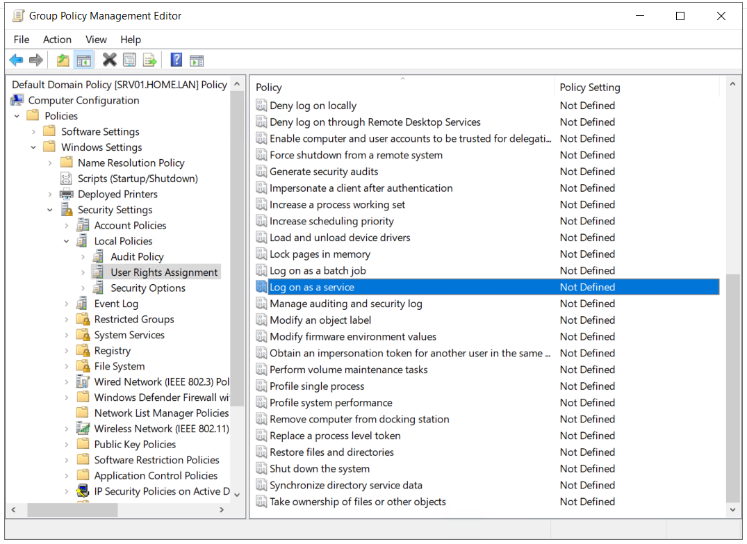 Computer Configuration > Windows Settings > Security Settings > Local Policies > User Rights Assignment > Log on as a service