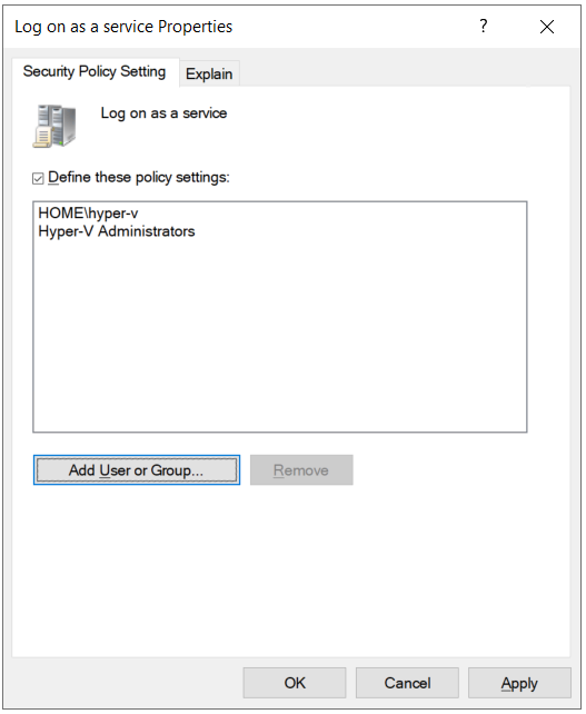 In this solution, we will modify the user rights for running the virtual machine. This solution consists of two steps; in the first step we will install Group Policy Management on Hyper-V host and then in the second step, we will modify the policy accordingly.