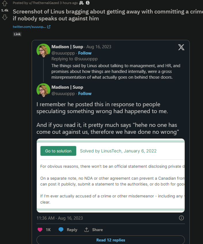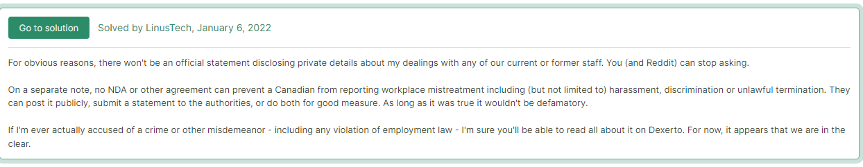 Remember that resignation confirmation by Linus above? Well, it didn’t age well and Reddit isn’t taking things lightly.