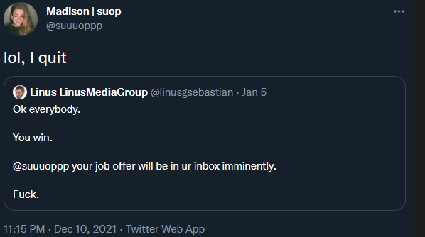Fast forward to 2021, and we have a video from LMG Clips where Linus was in the process of hiring new employees. You guessed it, Madison was a prime candidate got the job as indicated by a tweet from Linus.