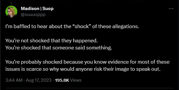 There are also multiple reports of groping and it does not end there. Madison was excluded from future videos, which answers many of the community’s concerns pertaining to her sudden disappearance. Other misogynistic comments include: