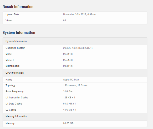 Today’s benchmarks have seemingly confirmed that Apple is indeed working on an M2 Max chip. This CPU features 12 cores or 2 cores higher than the M1 Max which launched last year. As per this test, the M2 Max chip was running at a base frequency of 3.54GHz and featured 4MB of L2 cache. The Mac used for this test features a massive 96GB of RAM.