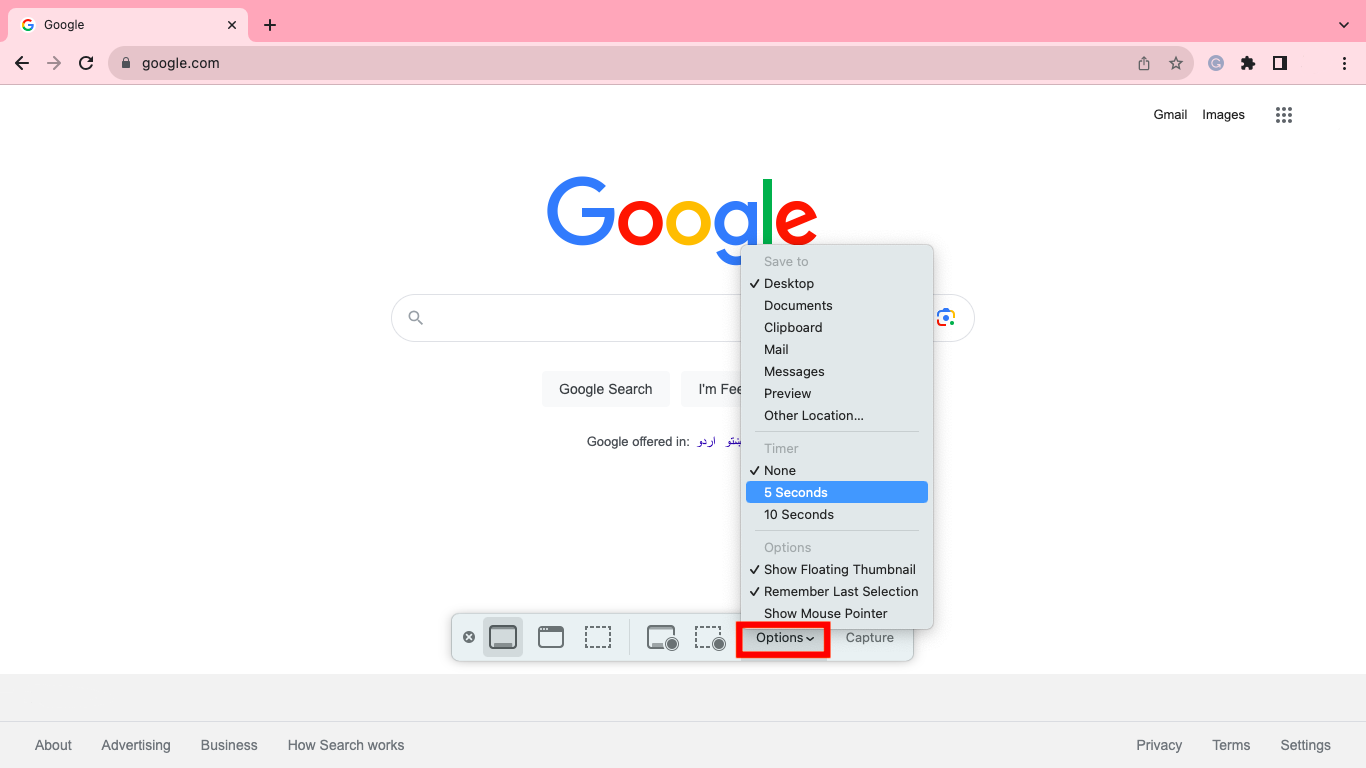Tip: Click Options to customize controls like where to store the screenshot and whether or not to include the pointer in the snapshot. For delayed catches, you can also specify a timer.
