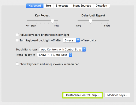 - Now click on Keyboard and then select Customize Control Strip at the bottom of the menu.