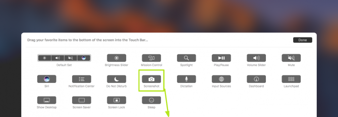 - Drag the Screenshot icon to the Touch Bar for easy access and tap Done.