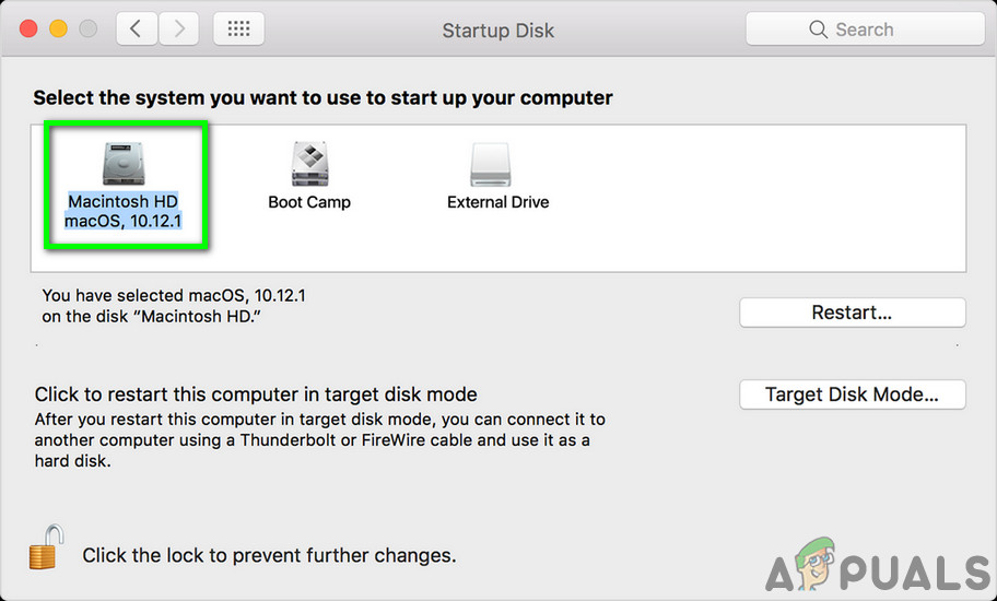 - Open your MacBook’s system preference. Then click on Startup Disk. Now click on the lock icon to unlock the setting. Then select your internal Macintosh HD and restart your system.