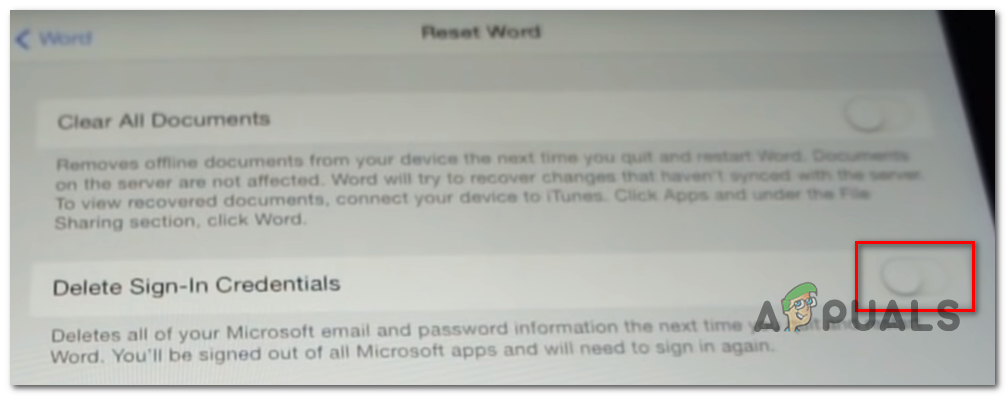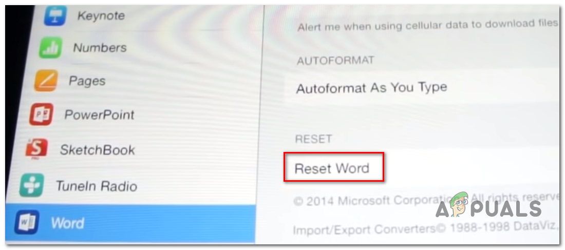 If you’re encountering the issue on an iPad or iPhone and you’ve just installed Word, chances are the issue is occurring due to a series of cached data that was generating during the installation sequence. Several iOS users that we’re struggling to resolve the ‘Machine activation error‘ have managed to fix the problem by going into Word’s setting and forcing the app to reset.