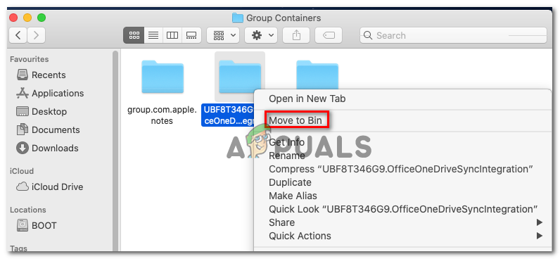 - Inside the Group Containers folder, right-click on each folder that starts with UBF and choose Move to Bin from the newly appeared context menu.