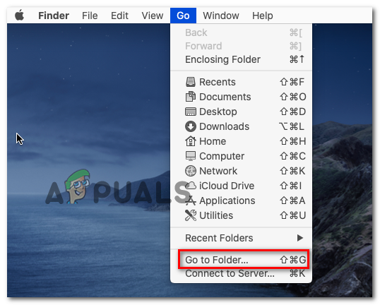 - To do this, access the Go menu from your default screen and click on Go to Folder from the newly appeared context menu.