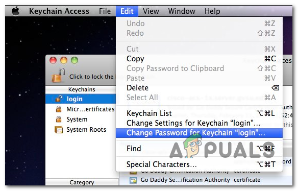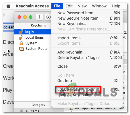Opening the KeyChain Access utility - Once you’re inside the Keychain Access app, select the login entry from the left-hand side menu. Next, go use the ribbon menu at the top to access the File menu and click on Lock Keychain “login”.