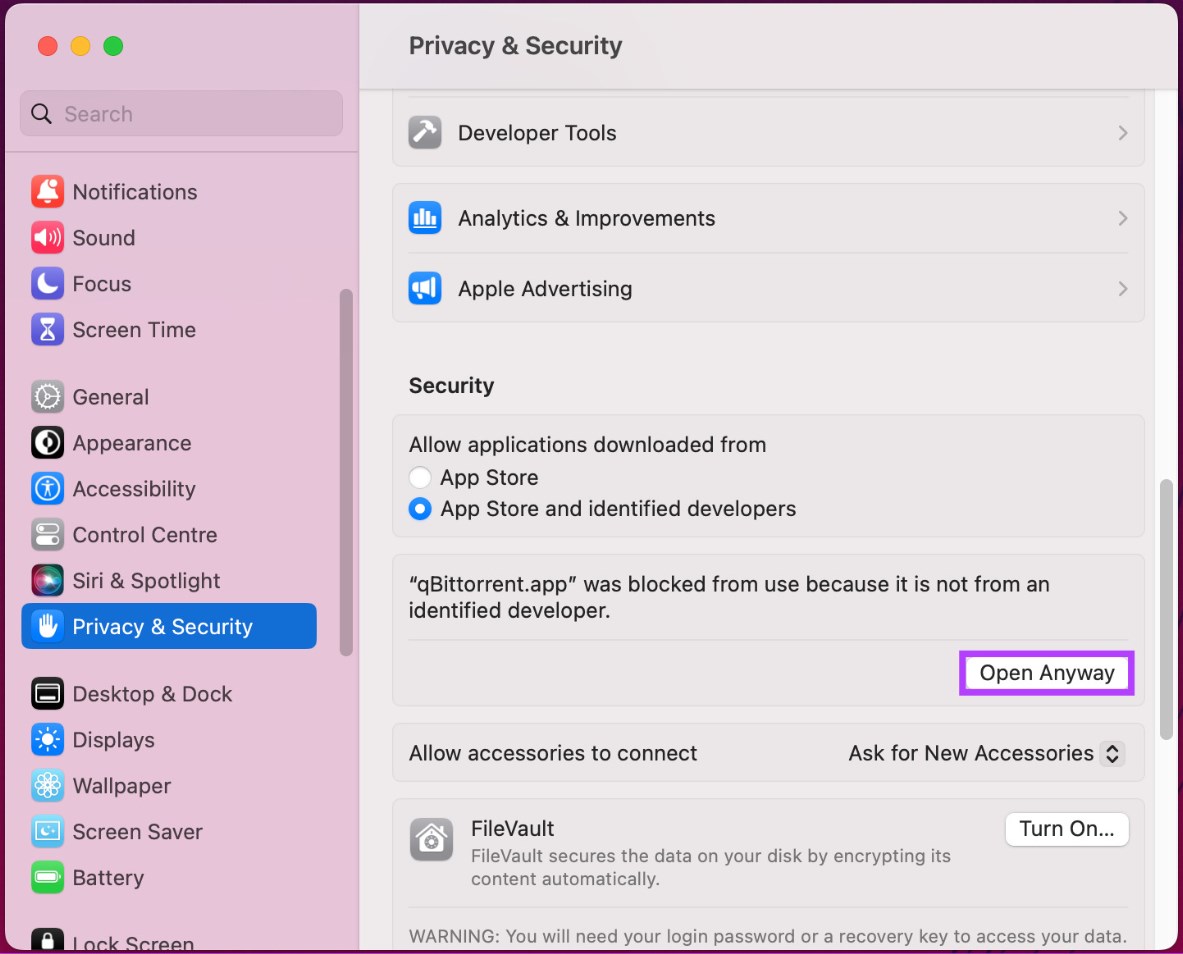 - Under the Security tab, a message will say, “[Unauthorised app’s name] was blocked from use because it is not from an identified developer.” Click on the “Open Anyway” button located right under it.