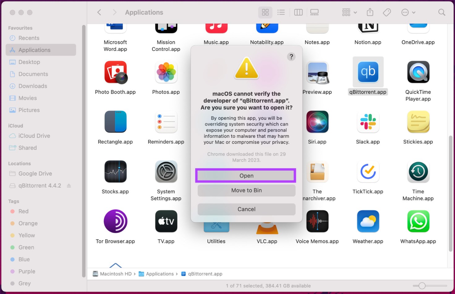 Select Applications - Locate the app, hold down the Control key, and click on the application to select “Open.”