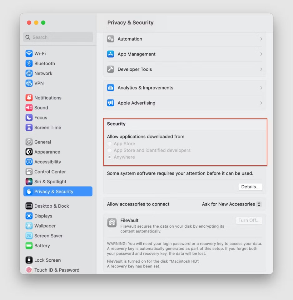 - Go to System Settings > Privacy & Security.