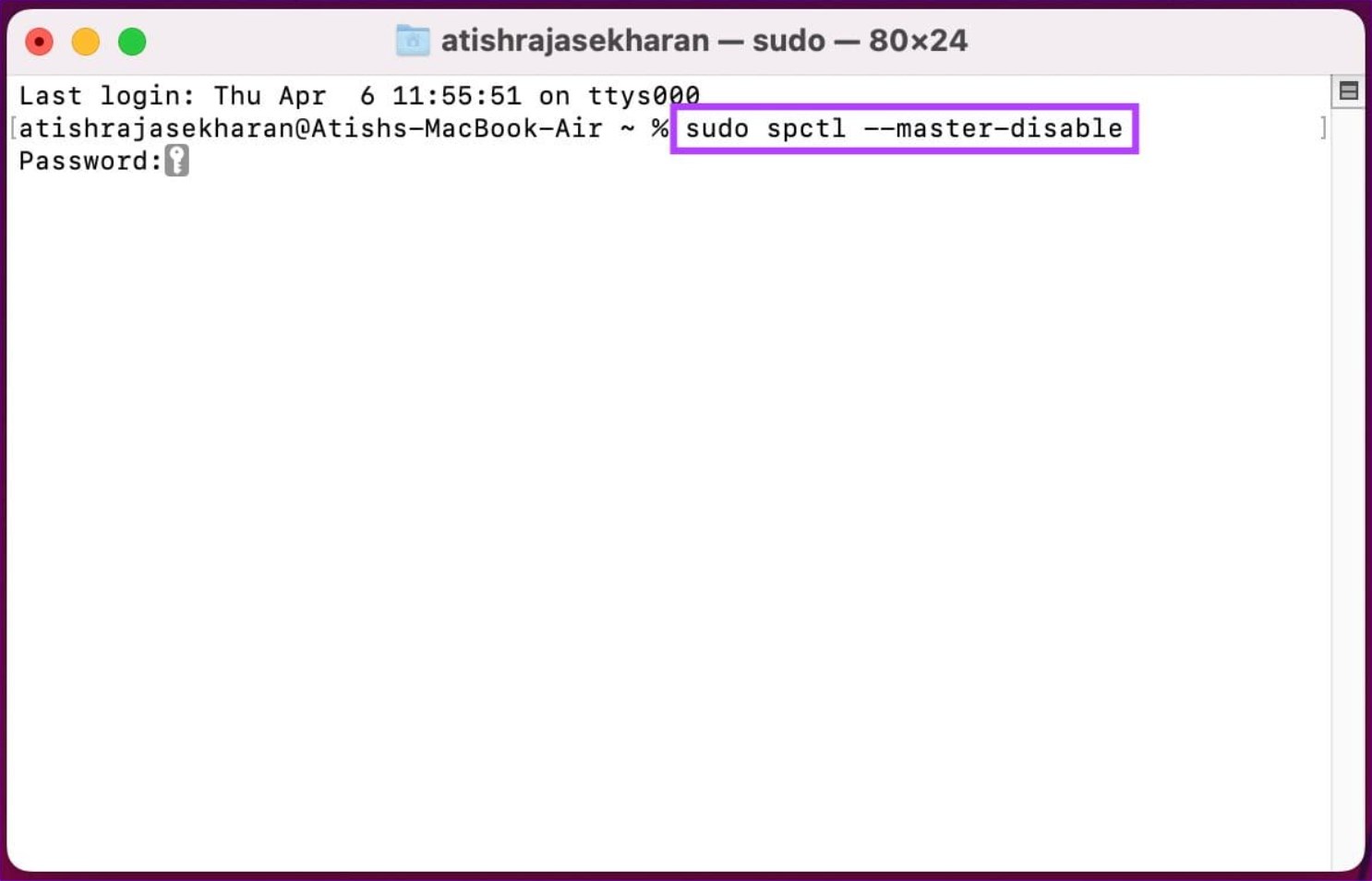 Type “sudo spctl –master-disable” command - Press the Enter key and enter your Mac’s password upon the next prompt.