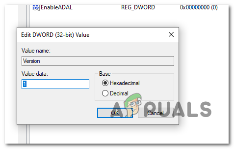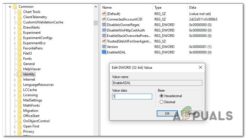 - Once you’re inside the Identity key, move over to the right-hand pane, double-click on EnableADAL and set the value to 1 and the Base to Hexadecimal.