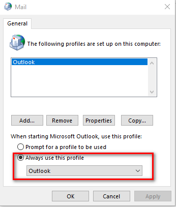 Adding the primary account again - Once the new account has been created, return to the main Mail dialog box, select the Always use this profile toggle and set it to Outlook using the drop-down menu. Finally, click Apply to save the changes.