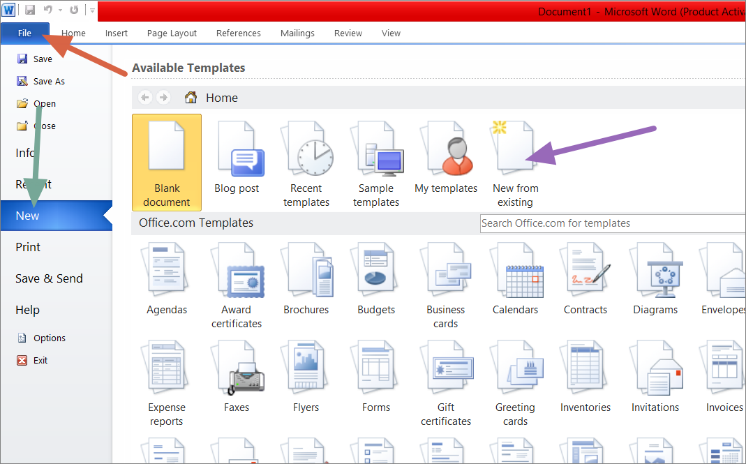 Click on the File tab in the top left corner of your Word window. From the menu, select New.