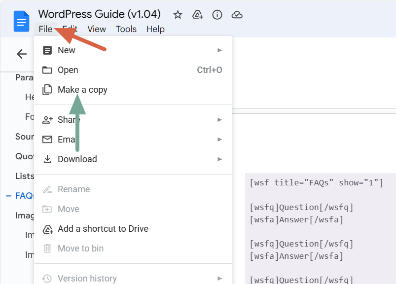 - In the dropdown menu, find and select the option that says Make a copy. This will make a copy of the existing document.