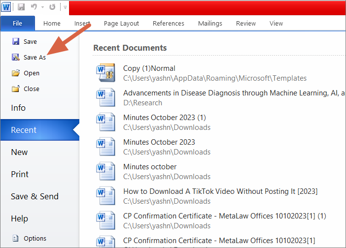 Click on the File tab at the top left corner of your Word window. From the menu, select Save As.