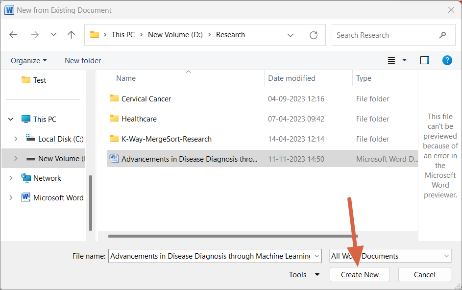 Once you’ve selected the file, click Create New. Word will open a new document that contains all the content and formatting of the original file.