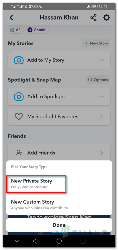 The “New Story” option on your profile page. - Choose New Private Story from the menu that pops up.