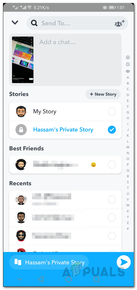 Your private story is now ready! - Take a photo or video, then tap the Send button.